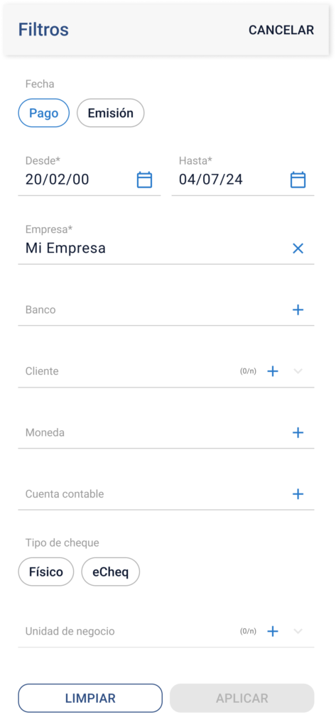 Tipo de chequeSelección simpleSelecciona ambos (“Físico” y “eCheq”) por defecto.