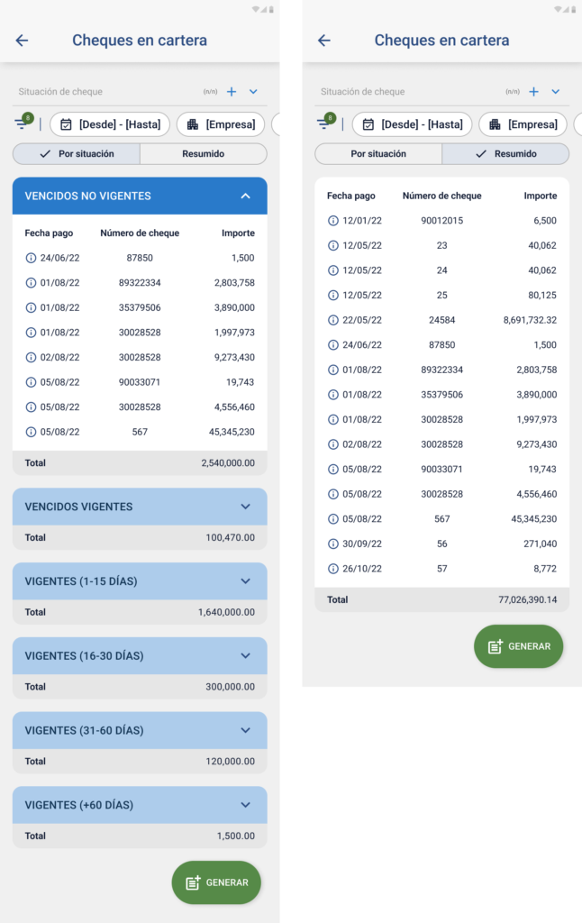• Permite visualizar los cheques agrupados en tarjetas según la situación, mostrando el importe total correspondiente.