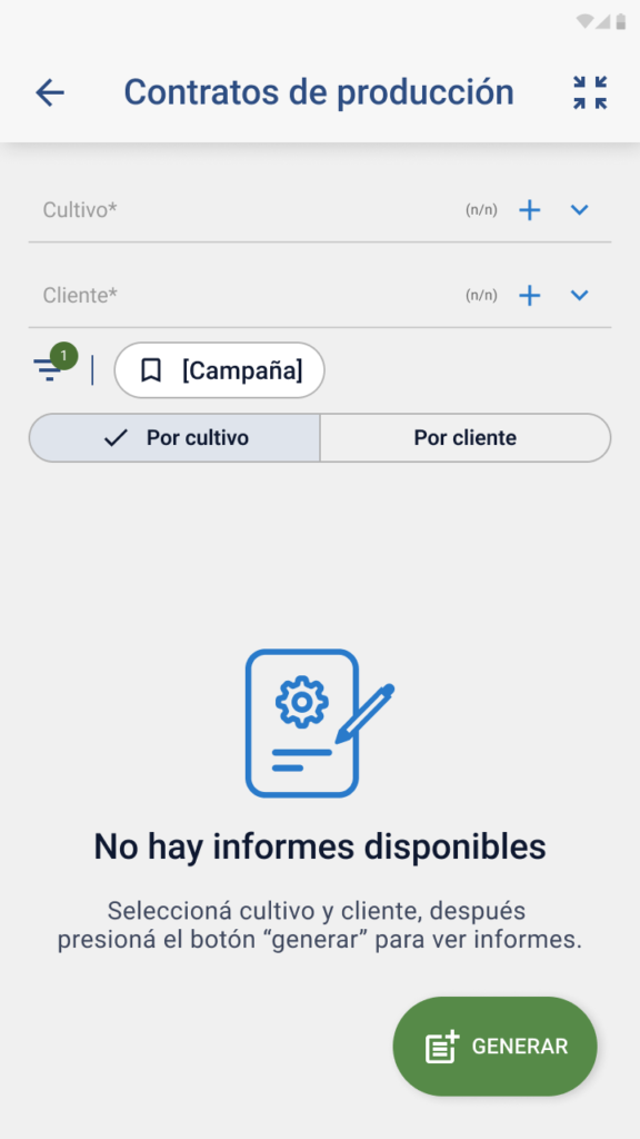 - Mensajes y validaciones impiden generar informes sin seleccionar mínimo cliente y cultivo.