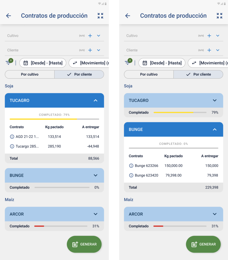 - Por cultivo: cada cultivo con una barra de avance del porcentaje de cumplimiento (kg entregados vs kg pactados).