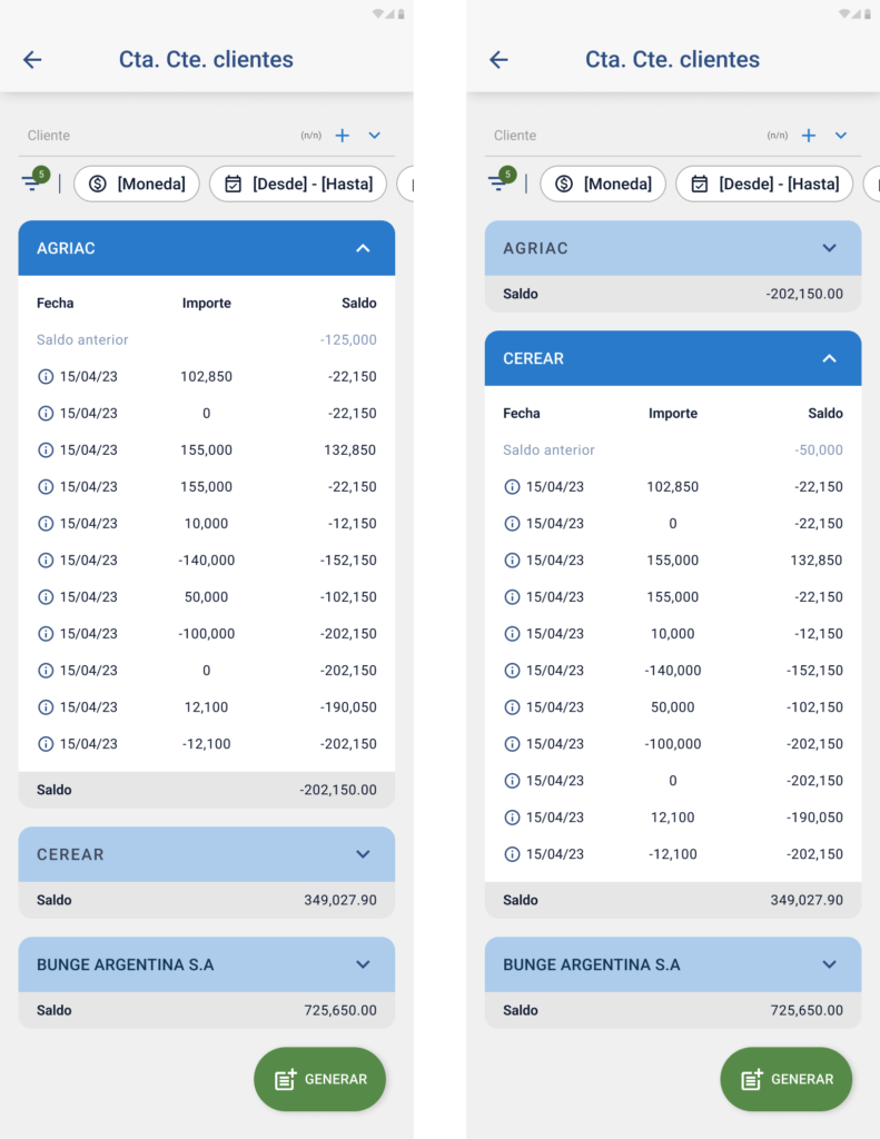 El informe de Cuenta Corriente Clientes permite consultar en línea el estado de cuenta, importes y deuda para uno o más clientes seleccionados, con información actualizada y filtrada según parámetros configurables desde la aplicación móvil.