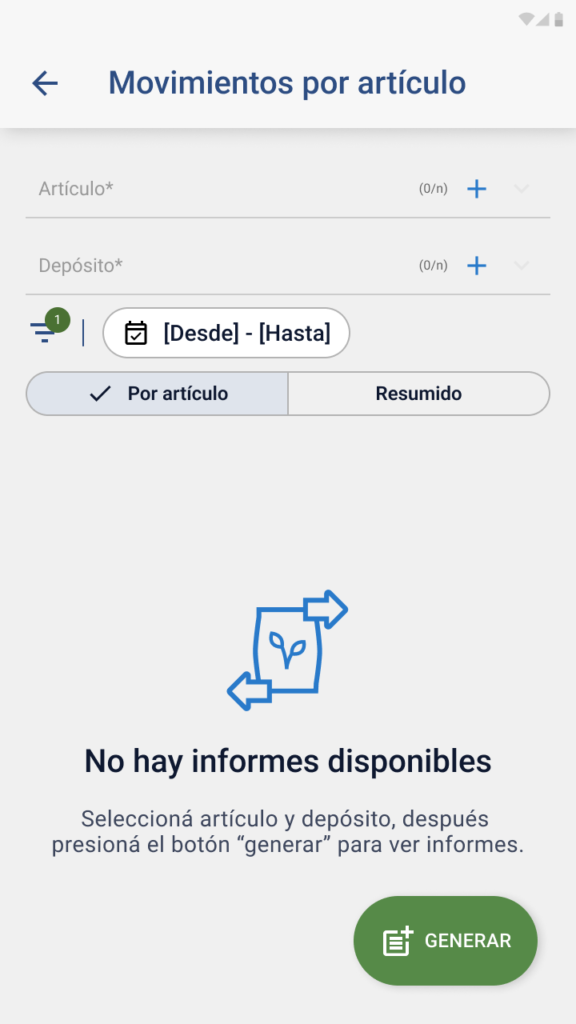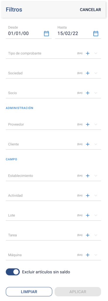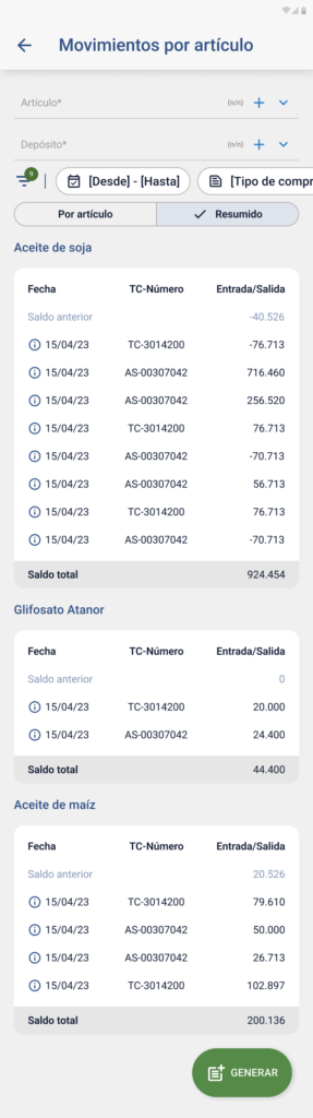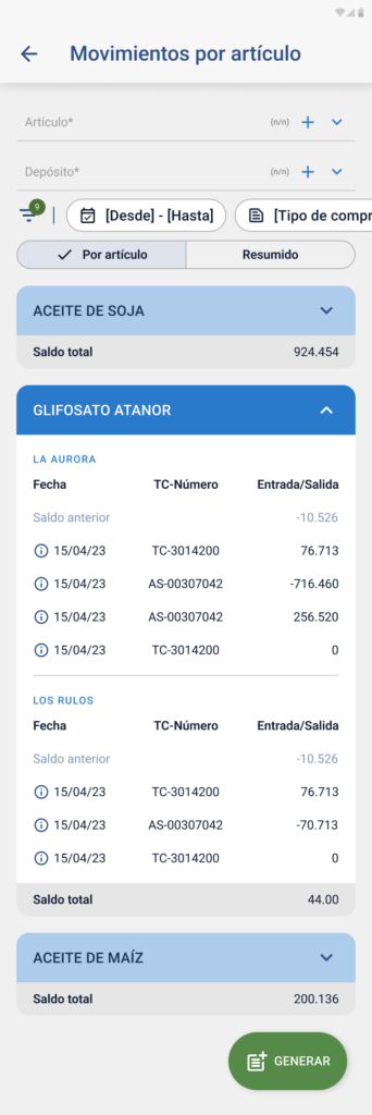 - Switch “Excluir artículos sin saldo”: Por defecto apagado. Si se activa, oculta artículos con saldo neto cero.