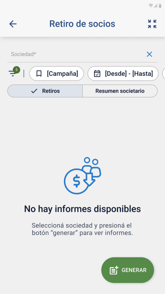 - Generar: Permite generar el informe únicamente si la sociedad está seleccionada. Si no, se muestra un label rojo debajo del selector (“Elegí una opción”).