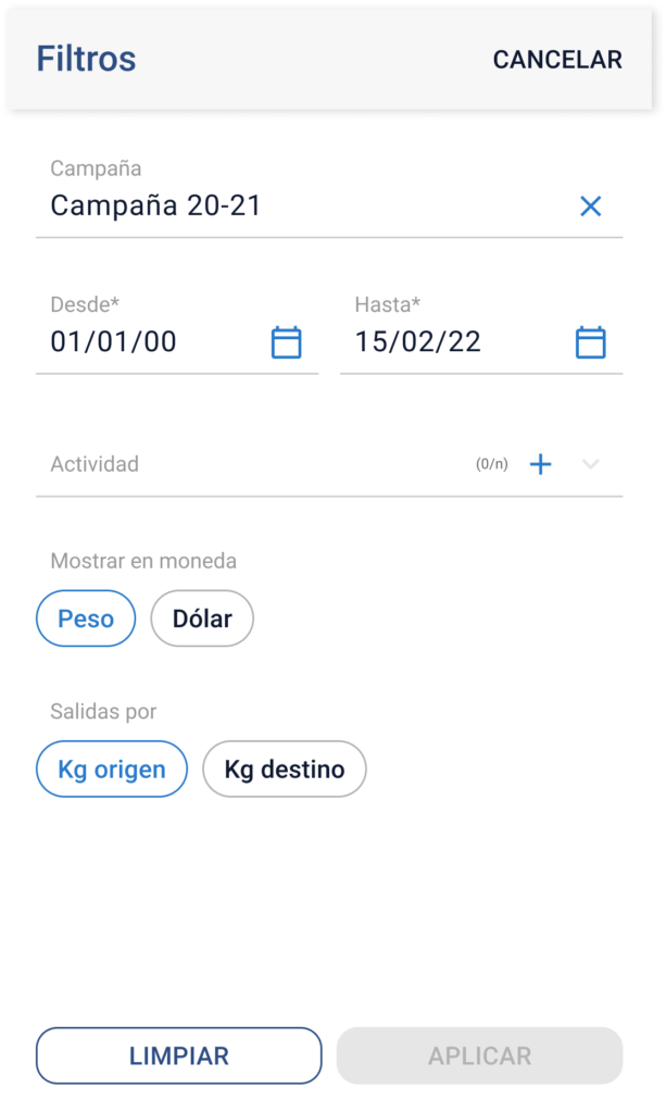 - Salidas por: Radio button entre “Kg origen” (por defecto) y “Kg destino”.