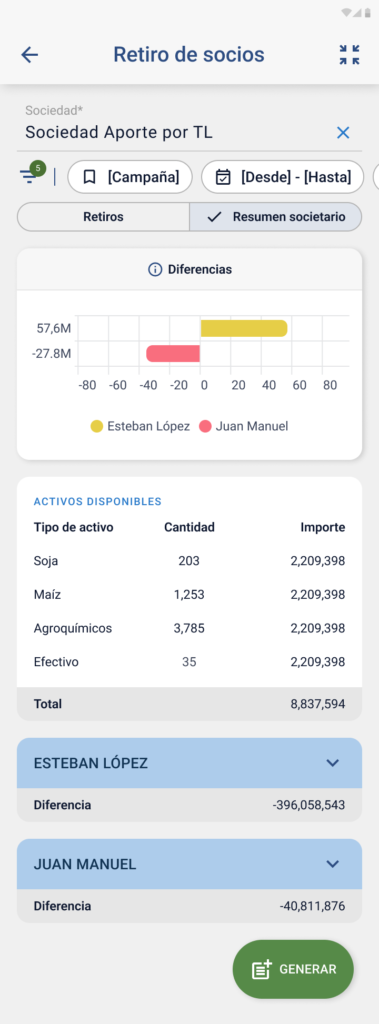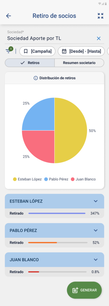 La funcionalidad Retiro de Socios permite consultar de manera online los retiros efectuados, los saldos pendientes y los activos disponibles de una sociedad. El informe se genera según los parámetros seleccionados y proporciona una visualización clara y dinámica tanto de los retiros individuales como de la distribución global de la sociedad.