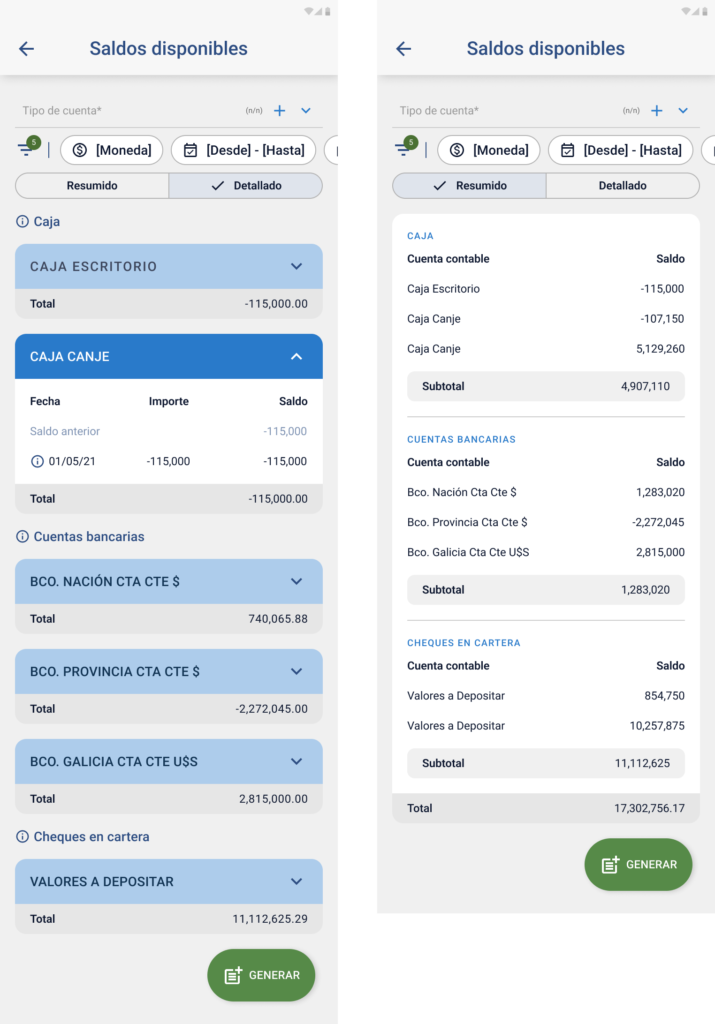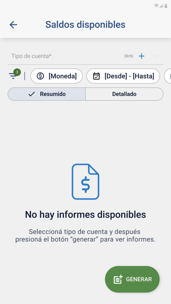 • Todos los filtros aplicados (excepto “tipo de cuenta” y “saldo anterior”) se muestran en la pantalla de inicio como chips.